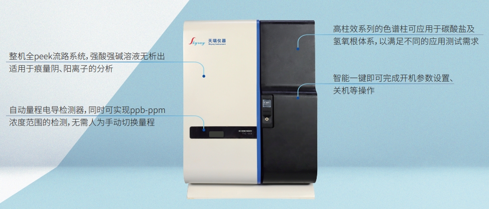TIC-680離子色譜儀是天瑞儀器在TIC-600的基礎(chǔ)上,推出的全新一款具有雙極電路、電磁閥進(jìn)樣、可搭載自動淋洗液發(fā)生器、同時(shí)可兼容安培檢測器、紫外檢測器等,滿足不同的樣品測試需求。該款產(chǎn)品搭載淋洗液自動發(fā)生器可實(shí)現(xiàn)梯度洗脫,滿足新國標(biāo)GB5750.10-2023生活飲用水中消毒副產(chǎn)物的測定;除此之外該產(chǎn)品既能滿足常規(guī)陰離子、陽離子、氰根及小分子有機(jī)酸的分析,也能與AFS、ICP、ICP-MS聯(lián)用進(jìn)行形態(tài)分析;普遍適用于環(huán)境、疾控、食品、電子、化工、醫(yī)藥、礦冶等領(lǐng)域。
