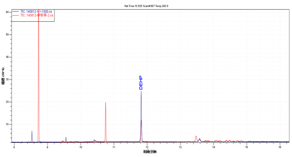 樣品TIC圖(藍(lán)色)與鄰苯混標(biāo)TIC圖(紅色)