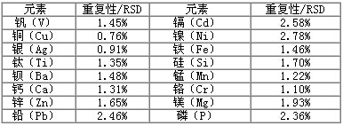 連續(xù)測試6份平行樣品,計算6次測試數(shù)據(jù)的相對標(biāo)準(zhǔn)偏差,即為重復(fù)性數(shù)據(jù),結(jié)果見下表