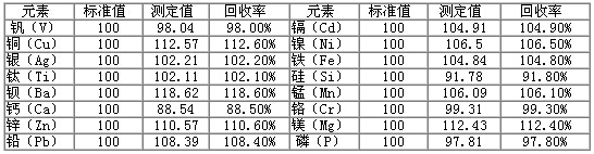 采用本方法測試潤滑油金屬含量光譜分析標(biāo)準(zhǔn)物質(zhì)GBW(E)130129、GBW(E)130132,對比實際測定值與標(biāo)準(zhǔn)值,得出實際測試的回收率,得到準(zhǔn)確度數(shù)據(jù),結(jié)果見下表