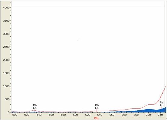 下圖實(shí)譜表示純銅rc101(Pb,0ppm)即本底、紅色虛譜為 鎳白銅313(Pb:60ppm)