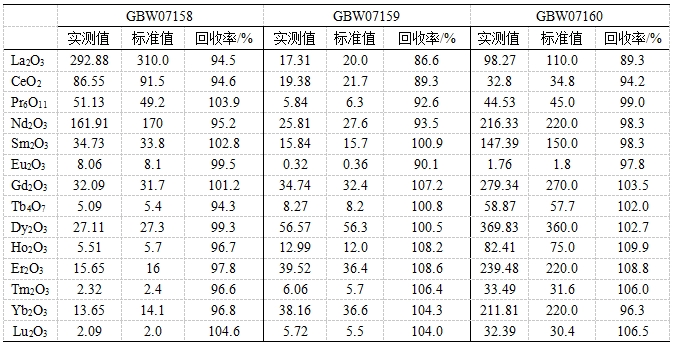 參考《GB/T 40798 離子型稀土原礦化學(xué)分析方法 稀土總量的測定 電感耦合等離子體質(zhì)譜法》,采用氫氟酸、硝酸、高氯酸進(jìn)行濕法消解。利用碰撞反應(yīng)模式控制氧化物產(chǎn)率,降低輕稀土氧化物/氫氧化物對(duì)其他稀土元素的干擾;并根據(jù)實(shí)際樣品中元素含量,校準(zhǔn)稀土氧化物/氫氧化物的干擾。對(duì)三個(gè)稀土礦標(biāo)準(zhǔn)物質(zhì)中14種稀土元素(以氧化物形式表示)進(jìn)行測試,各元素回收率為86.6 %~109.9%。