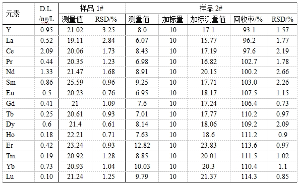 油田稀土示蹤劑主要用來考察油田井間的導(dǎo)通性,具有無放射性、安全穩(wěn)定、用量少、分析精度高等特點(diǎn)。將所得油田水樣搖勻過濾,稀硝酸稀釋一定倍數(shù),以內(nèi)標(biāo)法校正樣品基體對(duì)待測同位素影響,考察Y、La、Ce等15種稀土示蹤劑的檢出限、精密度(以RSD表示)、加標(biāo)回收率。發(fā)現(xiàn)檢出限為0.10~2.09ng/L;樣品1#的精密度為0.61%~3.25%;樣品2#中各元素加標(biāo)回收率為93.1%~114.3%,精密度為0.85%~2.66%。