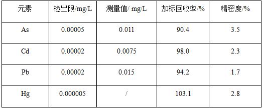 在碰撞反應(yīng)模式下,以內(nèi)標(biāo)法校正儀器信號(hào)漂移,將配制好的各元素標(biāo)準(zhǔn)溶液上機(jī)測試,繪制標(biāo)準(zhǔn)曲線,各元素標(biāo)準(zhǔn)工作曲線線性相關(guān)系數(shù)R>0.999;對(duì)樣品空白溶液平行測定11次,計(jì)算11次樣品空白值的標(biāo)準(zhǔn)偏差,并以三倍標(biāo)準(zhǔn)偏差/工作曲線斜率表示檢出限;間隔2min,對(duì)樣品平行測定7次,計(jì)算7次測試結(jié)果對(duì)應(yīng)的相對(duì)標(biāo)準(zhǔn)偏差,表示精密度;對(duì)樣品進(jìn)行加標(biāo)實(shí)驗(yàn),并計(jì)算加標(biāo)回收率。各元素檢出限為0.000005~0.00005mg/L,加標(biāo)回收率為90.4%~103.1%,精密度為1.7%~3.5%。