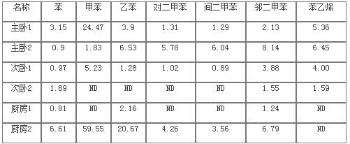 在剛裝修完的兩套住宅的三處不同地點進行取樣并分析7種苯系物的含量,測試結(jié)果見表7。