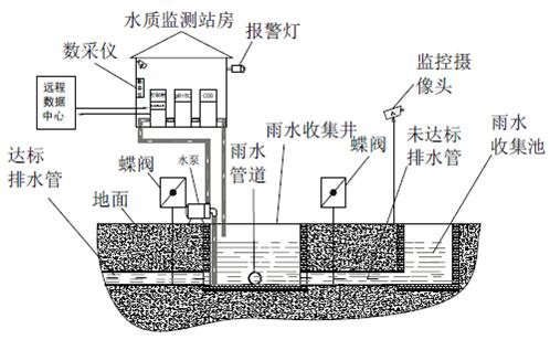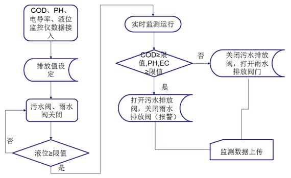 監(jiān)測(cè)系統(tǒng)控制采樣單元將水樣導(dǎo)入監(jiān)測(cè)室,并啟動(dòng)監(jiān)測(cè)水質(zhì)的COD、pH、電導(dǎo)率等常規(guī)參數(shù)。達(dá)標(biāo)雨水通過(guò)電控閥門(mén)排入市政雨水管網(wǎng),一旦超標(biāo)電控閥門(mén)關(guān)閉,禁止雨水排入市政雨水管網(wǎng),并通過(guò)水泵將超標(biāo)雨水泵入企業(yè)污水處理系統(tǒng)處理,達(dá)標(biāo)后排放至市政污水管網(wǎng)。同時(shí)所有監(jiān)測(cè)數(shù)據(jù)經(jīng)由數(shù)據(jù)采集單元將數(shù)據(jù)統(tǒng)計(jì)后,由傳輸設(shè)備傳輸至企業(yè)監(jiān)測(cè)中心或環(huán)保局,由此完成對(duì)雨水排放自動(dòng)、實(shí)時(shí)、連續(xù)監(jiān)控。