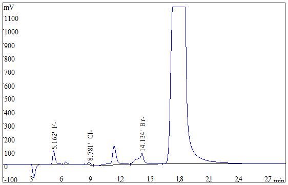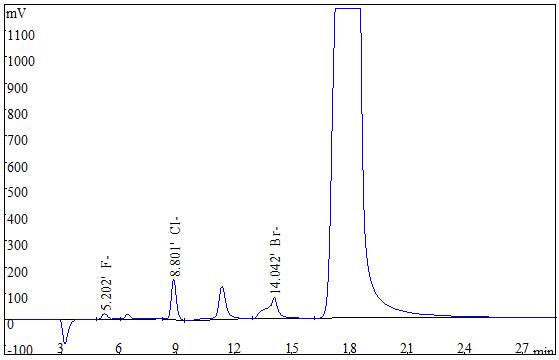 準(zhǔn)確稱取0.2g(精確至0.0001g)試樣,采用氧彈燃燒后冷卻定容,經(jīng)0.22μm的水系濾膜過(guò)濾后上機(jī)得到測(cè)試譜圖如下圖2、圖3所示。
