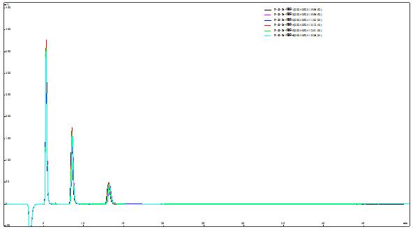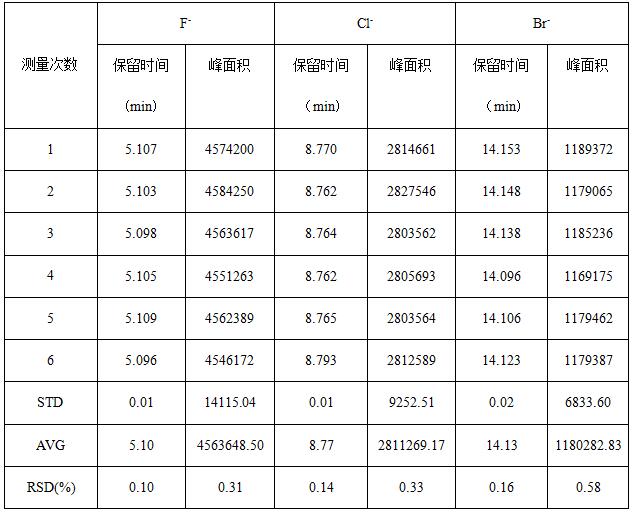取2.0μg/mL F-、Cl-、Br-混合標(biāo)準(zhǔn)標(biāo)準(zhǔn)溶液重復(fù)進(jìn)樣6次,考察保留時(shí)間和峰面積的重復(fù)性,詳見圖4;其中保留時(shí)間(tR)相對(duì)偏差在0.10%-0.16%之間,峰面積(S)的相對(duì)標(biāo)準(zhǔn)偏差在0.38%~0.53%之間,重復(fù)性結(jié)果詳見表1。
