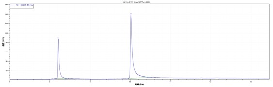 目標(biāo)物在5ppm-100ppm線性良好。取空白食品樣品加標(biāo),樣品經(jīng)過正己烷和乙酸乙酯(1+1)超聲萃取。20ppm加標(biāo)水平下譜圖如下,得到了比較滿意的效果。