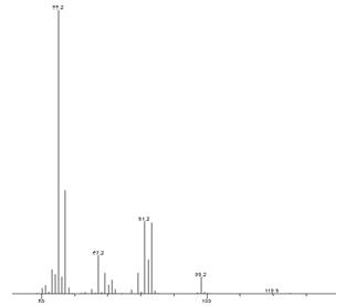 甜蜜素的主要衍生物環(huán)己醇亞硝酸酯作為定性和定量,如圖1。保留時(shí)間8.511min.定性離子(m/z)為55,81,83。定量離子為55。質(zhì)譜圖見圖2.