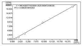 準(zhǔn)確吸取濃度為10ug/mL的甜蜜素標(biāo)準(zhǔn)溶液10ul于50ml離心管中對(duì)應(yīng)衍生物濃度分別為2ug/mL、10ug/mL、20ug/mL、100ug/mL、200ug/mL,按照上述標(biāo)樣衍生化步驟進(jìn)行衍生化,進(jìn)行線性測(cè)試。實(shí)驗(yàn)所得線性方程為:y=940.43x-3525.57,線性相關(guān)系數(shù)為0.9984,如圖5所示。
