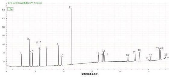 2.2 23種偶氮染料標準溶液TIC(總離子流檢測圖):