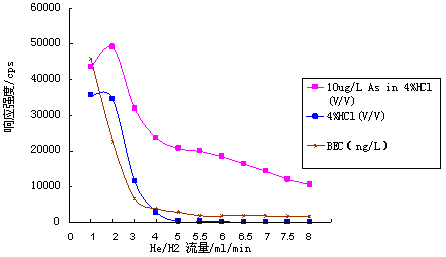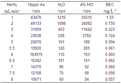 儀器首先在標(biāo)準(zhǔn)模式下進(jìn)行參數(shù)優(yōu)化(利用10μg·L-1的Li、Co、In、U、Ce調(diào)諧液對(duì)儀器工作參數(shù)進(jìn)行調(diào)節(jié),使儀器靈敏度高,同時(shí)氧化物及雙電荷產(chǎn)率小于3%);再開啟He/H2碰撞反應(yīng)氣,逐步增大He/H2流量,測(cè)試超純水、4%HCl及10μg·L-1 As(4%HCl介質(zhì))在75amu處的響應(yīng)信號(hào),計(jì)算其背景等效濃度(詳細(xì)數(shù)據(jù)見(jiàn)表1及圖1);并利用As標(biāo)液進(jìn)一步優(yōu)化He/H2流量,得到儀器工作參數(shù)如表2所示。