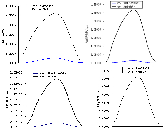 圖3.52Cr、56Fe、75As、80Se在標(biāo)準(zhǔn)模式及碰撞反應(yīng)模式下響應(yīng)信號(hào)(52Cr、56Fe)