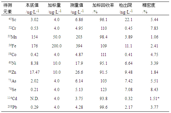 在儀器優(yōu)化工作參數(shù)條件下,對(duì)樣品溶液及加標(biāo)樣液進(jìn)行測(cè)試,計(jì)算其加標(biāo)回收率;對(duì)樣品空白溶液平行測(cè)定7次,以三倍空白信號(hào)標(biāo)準(zhǔn)偏差/靈敏度對(duì)應(yīng)的濃度為檢出限;同時(shí)對(duì)樣品溶液平行測(cè)定11次(間隔2min),計(jì)算其相對(duì)標(biāo)準(zhǔn)偏差,考察精密度,數(shù)據(jù)見(jiàn)表4。各元素檢出限在0.41-22.07ng/L之間,加標(biāo)回收率在93.82%-123.10%之間,精密度在1.06%-8.43%之間。